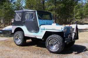 “Nice Condition. Rebuilt F-head out of a CJ3B,(not a flat head) 3 speed tranny, Baby blue with pin stripping, custom 6pt. roll cage, 6000# wench, tow bar, rear jump seat with storage under, Best Tops soft top with full doors, 2 1/2″ Rancho lift, 31X10.50 BF Goodrich Mud Terrains, chrome wheels, Dana 44 rear (welded) with 5.38 gears, Ready for a weekend in the woods!”