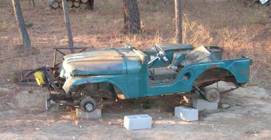 Here is the Jeep soon after I picked it up from my grandfathers old ranch. I had already started to disassemble it. It’s a 1955 CJ5 which he purchased in 1959. About ten years ago he told me that his best guess was that it had about 500,000 miles on it. It has seen a lot of abuse and he made many modifications to it. That’s a Hudson steering wheel and column.