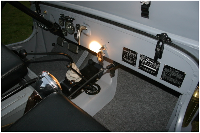 I insisted that all law enforcement components were vintage, original period equipment.  On the front right fender is a model “O” Federal police siren.  It is very loud.  On the left front fender is a vintage Griffin military police STOP light (the type used by MPs in WWII) and after the war, would have been a natural adaptation for civilian police use.  The front bumper boasts a pair of vintage 6 inch Unity Mfg. cobalt blue & red lens police lamps wired for a wig-wag alternating flash.  Additionally, I installed a pair of vintage 6 inch Unity driving/fog lights.  With the siren, red lens STOP light, alternating blue & red lens flashers, and amber lens lights blazing, a bad guy would certainly have known that the Sheriff had arrived!  Mounted on the rear (driver’s side) is a vintage Unity amber lens lamp wired for duty as a law-enforcement Amber caution flasher.  Another vintage Unity lamp was added as a rear back-up lamp and is mounted on the rear bumper next to the tow plate.  In addition, like any sheriff patrol vehicle, this jeep comes equipped with a beautiful vintage Unity hand-held spotlight mounted on a post , just behind the shift levers, between the driver and passenger seats and within easy reach of the driver.  The spot light can also be mounted on a bracket fixed on top of the windshield frame, just to the right of center.  Behind each front seat are canvas bags for first aid kits, flares, bullets and shotgun shells and other associated items.  Because these early jeeps did not yet feature a glove box or trunk, I fitted this jeep with a locking metal 9mm ammunition case between the driver and passenger seats. I made this modification on my “keeper” and use it all the time.  So, although it is not original equipment, you’ll be surprised at how much you’ll use this little feature!  The jeep comes with a brand new, original specification, Summer Canvas Top from Beachwood Canvas ® (not cheap but only one of two companies that still makes the originals, and is by far, the best quality).  Of course, it has original top bows to support the canvas top. The jeep even comes with a shotgun butt-mount bracket (not mounted but comes with the jeep.  I left this detail to the buyer’s discretion).  Of course, the upholstery is also brand new.  I had it done in black textured vinyl because it looks good with the flat-grey paint scheme that I selected.