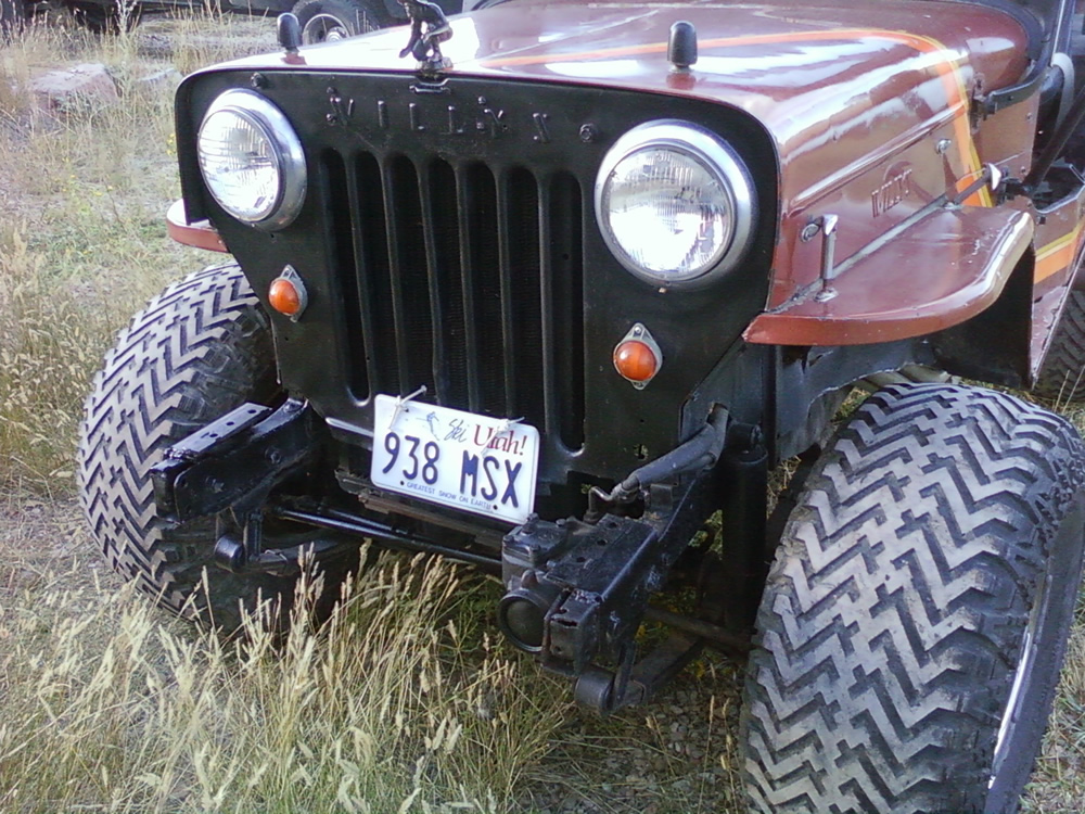 “1953 WILLYS JEEP – HIGH HOOD, 350 Chevy Engine, 4 – Speed Transmission / 4 Wheel Drive. 4 Point Harness Seat Belts, Tilt Steering Wheel, Ragtop + Side Doors + back seat, Padded Leather Seat Covers, Chrome Wheels, Holley Headers, Mickey Thompson Baja Tires, MOAB READY-Come See for Yourself!, Legend has it this Jeep won some title in the Rubicon Run, and was featured in a Hot Rod Jeep Magazine, + it has a cool Miner dude for a hood ornament”