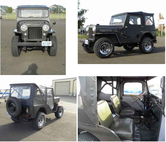 “1954 CJ3B Willys Jeep, The engine is a 134 F head with new pistons, rings and bearings, rebuilt carb, fuel pump, alternator and starter. The differentials has been overhauled along with the transfer case and transmission, rebuilt wheel cylinders, new brake lines, brake linings and fuel lines. The chassis has been stripped and painted, new leaf springs, shakles, U bolts and bushings. New soft top with doors and new heater. Original wheels and new military tires.”