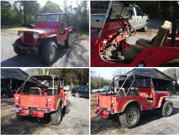 “1946 Willys Jeep . 4 cylinder chevrolet engine, buckshot tires, red with black bikini top. Everything works.”