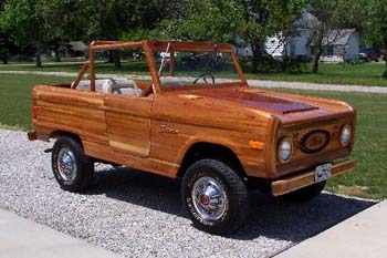 In the case of the 1977 Cherry Ford Bronco below, as you can see in the before and after pics, the body was pretty trashed and in need of something new.  The pieces are all 7/8″ to 1″ pieces glued and screwed together.  The bumpers and trim are done in Oak and Ash.  A single coat of linseed Oil and three coats of Marine Varnish protect the finish and the owners clean it with furniture polish.  Surprisingly, the new  wooden body is actually 300lbs lighter than the original metal.