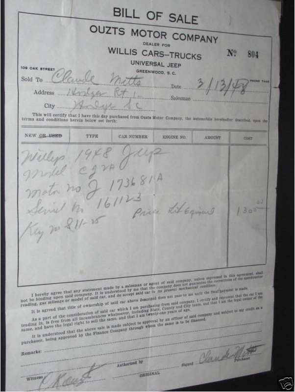 “I am selling my 1948 CJ2A. I am located in Lexington, SC. This Jeep was bought brand new by my Grandfather in March of 1948. I have the original bill of sale as well as a clear title. My grandfather passed away in 1987 and the Jeep sat in a barn until 2007. The Jeep is now in good running order, but I do not have the dedication or the funds to take it to the next level of restoration.”