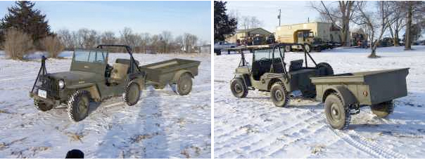 “1946 willys cj2a jeep and ww2 m100 trailer, jeep has been overhauled 645 miles ago, body work is all done,OD green paint, new 12 volt wiring, 6.00- 16 snow tires w/spare, brush guard/tow bar,engine runs very good, the trailer has fresh paint, new floor, new springs and u bolts, new bearings and seals, Jeep and Trailer are very hard to find in this good of shape. 563-529-0839 $5700 must sell”