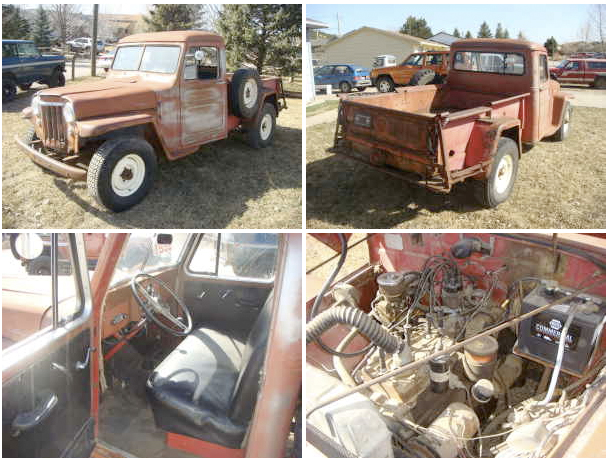 “1956 Willys pickup.All original. Box has been modified slightly. Must have been some kind of ranch truck. Runs fine but after driving around for a while oil pressure gets low. has a little ticking noise. Needs gas tank(missing was rusted out) and fuel pump(leaks) to get back on road. Odometer says 21000 miles, not sure if that is correct. pedals feel solid and shifts fine in all gears, 4×4, low range. Previous own did work on transfer case and interior. Still 6 volt I drove it around Rapid the winter of 07/08 a lot. Been sitting most of time since then. I just start it up every now and then. I don”t have time to fix it up. Has good tires and spare set of tires and wheels. Call (605) 391-2910 or email me if interested. ALL OFFERS BEING CONSIDERED. If you want pictures of specific areas, let me know i will email them.”
