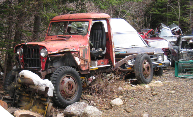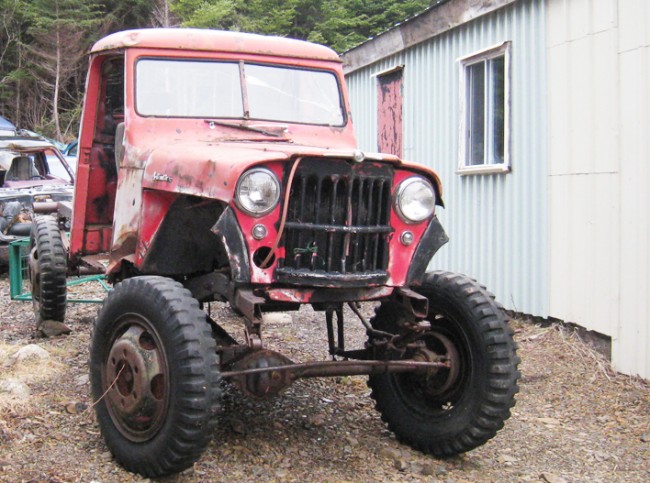 “Here are the pictures of the 55 Willys as I found it in a scrape metal collectors yard, it has its original running Super Hurricane engine 4 wheel drive components, head lights, park lights and dash all in tack, 20″ wheels were welded to the original 16’s and it spent the last few years hauling fire wood in rural Newfoundland. It had been abandoned and was set to go to the crusher when I found it and hauled it home. Not sure at this point what I will do with it, it’s safe for now.”