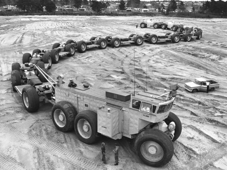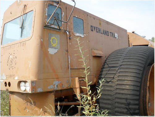 “In 1962, the Army tested a machine known as The Overland Train at Yuma Proving Ground in Arizona. It was designed to carry equipment and supplies over both on- and off-road terrains. The train consisted of the control car, ten self tracking cargo cars, and two power generating cars. It was 565 feet long and could haul 150 tons of cargo. The control car also contained living quarters for a crew of six, complete with sleeping, eating and sanitation facilities.