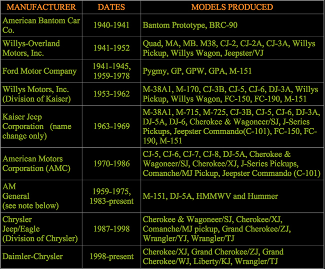 I ran across JeepGod’s website today. There’s a variety of interesting tidbits on the site, including an inexpensive solution for an air compressor, a nicely drawn out map for navigating Uwharrie National Forest in North Carolina, and the below list of Jeep Manufacturers, which provides some details into the specific companies that manufactured the vehicles we generally describe as Jeep or Willys. I hadn’t thought of organizing a list quite like this, so I thought I’d highlight it for readers. It’s certainly not an exhaustive list, as there’s no FC-170 listed, but that’s a minor quibble I think.