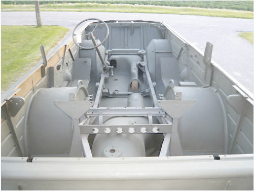 “Ford GPA Amphibious jeep. This is a NOS (yes, new old stock) hull that was never used. I know for sure because I have drilled all of the holes for the springbrackets myself when we put the frame in for the first time. We inspected the wheelwells very carefully and sanded of the paint to see if there were holes welded. It was all flat sheetmetal and the only holes present were the ones for the shockabsorber pins and the breaklines