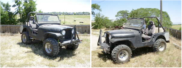 “This is a 55 Willys Jeep CJ5 with bikini top. It has a good strong 350 engine, a 4.11 Dana 44 rear axle with posi rear end. The transmission is a T-18 Toploader 4-speed. It has a Spicer transfercase and nice large new 31 X 12.5 X 15 TSL Bogger tires. I also have a spare set of rims, tires & off road lights that can go with it. $3000 Please call 830-9597”