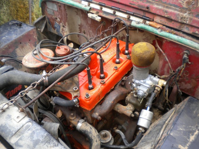 I talked to the guy yesterday and he said that he had to replace the coil but was able to get it started and drove it around his yard. Brakes are useless. He tried to start it with me on the line and it took a little effort but it did start. Looks like there is a hole in the firewall? Seems the dayglow orage they sprayed in the engine bay paint went thru and the wndow looks to be plexiglass. Also he said that the top has no glass. And I just love the cover the guages and spray the rest paint job.