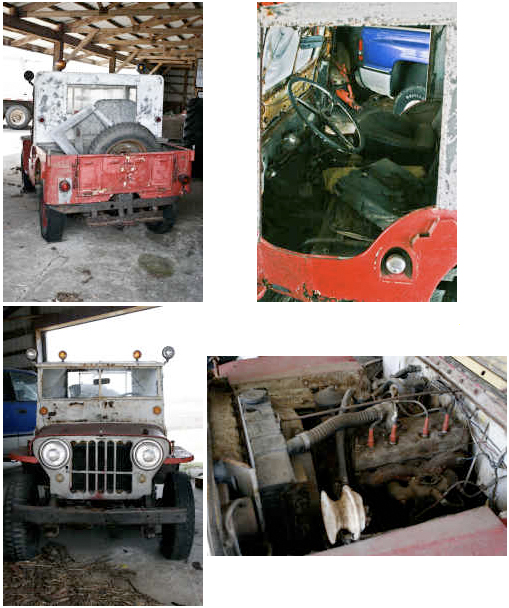 “An old red and white jeep willys the body is still in great shape the engine has most parts needs some work perfect piece of history needs new windshield. ”