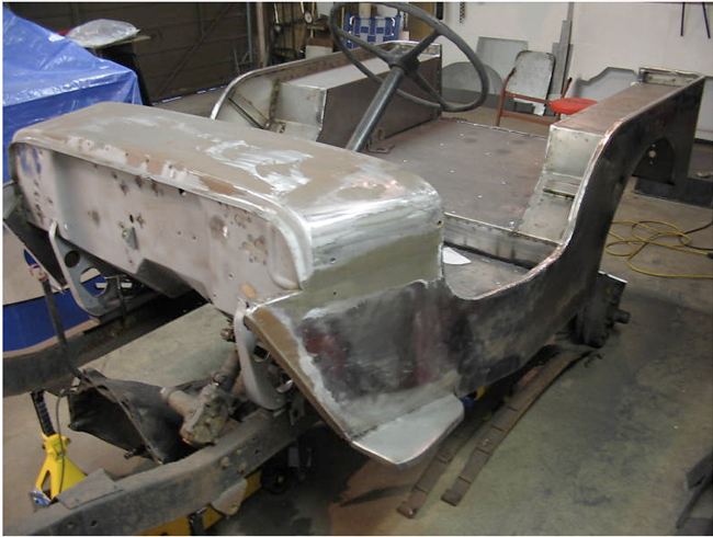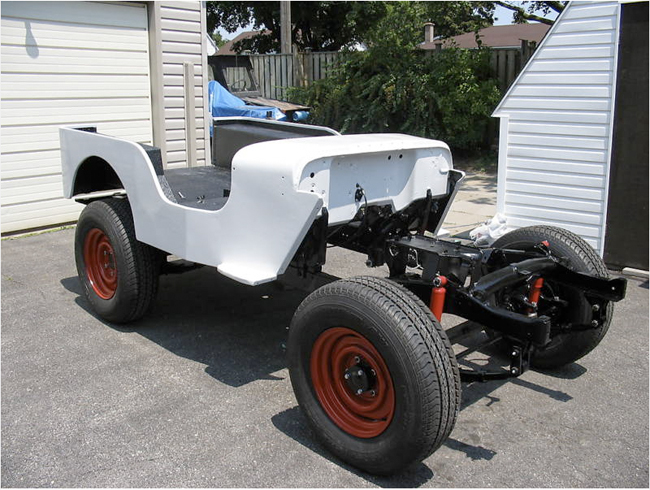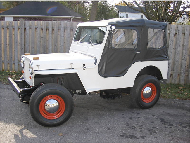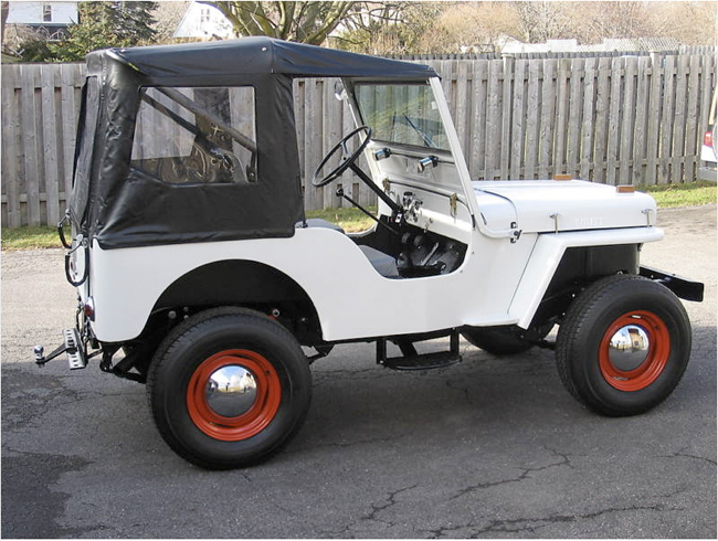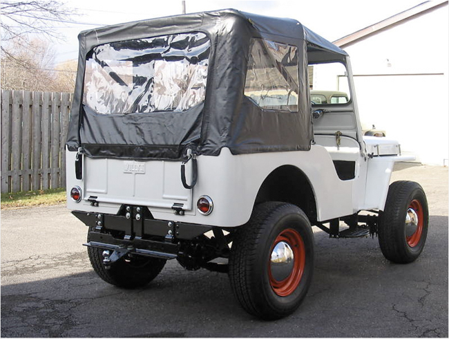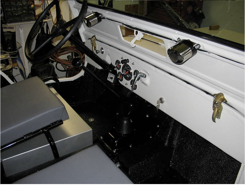 “I started out with a total scrap basket case. The entire Jeep is metal! Repop body panels are: front fenders, grille, hood, windshield frame(CJ3A) and the tailgate. I built the majority of the body tub which included all new floor braces made out of rectangular tubing. This body tub is far superior in strength when compared to the original design. Its not perfectly straight, i wanted it to look more original as they weren’t exactly perfect either. The only parts left on this Jeep when it left Toledo back in ’47 are the headlight buckets, the cowl section and the vin tag. I bought a repop passenger seat frame, the drivers seat is an original M38 seat frame(NOS). There is a custom made gas tank under the driver seat(approx. 12gal.) and a storage compartment under the passenger seat(lockable). All new Autometer gauges are used. The entire steering column including the steering wheel are brand new, the steering box housing is the original with all new guts and pitman arm. Hsa its original horn too! This Jeep includes the Best Top as seen in the pics and comes with the doors too. There is a small aftermarket heater on the passenger side. The radiator is a repop of the original. 1950 repop Pontiac taillights are used. The Jeep looks like it is white, it was supposed to be gray, but came out the colour you see in the pics, an off white that looks kinda gray, depending on the lighting.