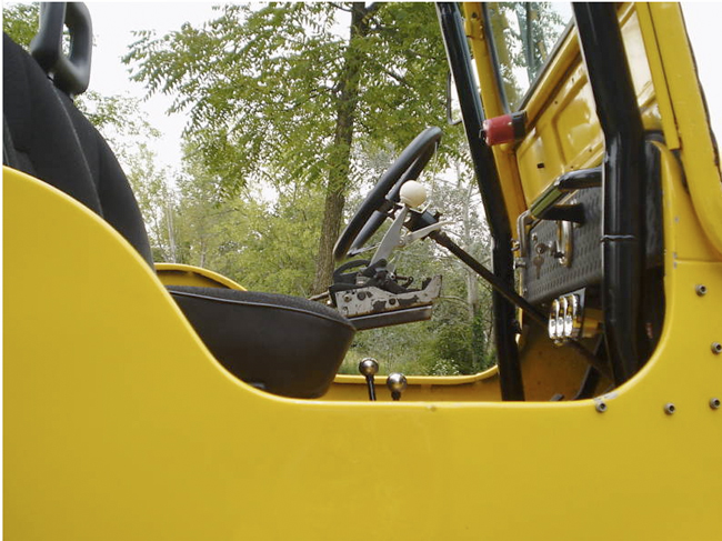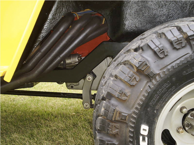 Chassis: Custom built 2” x 3” tube frame with: frame mounted 8-point roll cage, heavy duty spring perches, military-wrap springs, heavy duty shackles and shackle bolts (w/ greasable zerks), heavy duty shock absorbers, removable transmission cross-member, heavy duty motor mounts, tube brush bar & bumper, and GM Power steering (Saginaw box, 4.25 turns lock to lock).