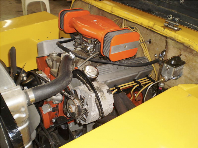 Fiberglass body and fenders, original windshield & grill shell. Wilwood aluminum swing pedal assembly & brake master cylinder. Offenhauser throttle linkage. Quick disconnect steering wheel. Holley high-volume electric fuel pump. Holley high pressure fuel regulator. Fram high-volume fuel filter. ½” aluminum fuel line.