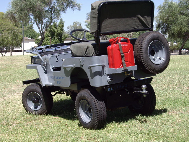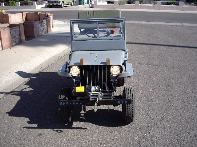 It has a 12volt electrical system with working headlights from Harbor Freight, WW II blackout lights for the front parking lights, and a WW II blackout lens with red LED for the taillight, a Harbor Freight 2000lb winch and a trailer hitch and receiver on the rear. I fabricated the front and rear bumpers to match the Willys stuff. I used EZ Go golf cart front hubs to get 4 bolt pattern for the Harbor Freight wheels and tires. I modified the rear axles to accept the 4 bolt wheels. I mounted a spare tire on the rear and fabricated a “jerry can” mount for the 1.5 gallon jerry can that is the fuel tank. I used the old clutch and brake pedals from the CJ3A and fabricated the shift linkage for the 5 speed transmission. The seat is a 1950s Willys station wagon driver’s side seat that I modified to do a double fold forward, where it covers the 12 volt battery. The windshield has Lexan inserted and a buddy made me a to scale WW II rifle mount for the back of the windshield. He also has restored WW II Jeeps, one MB that he just sold and the other is a 1944 Ford GPW US Navy Jeep. I painted it in WW II US Navy paint scheme, as our son is retired USN.”