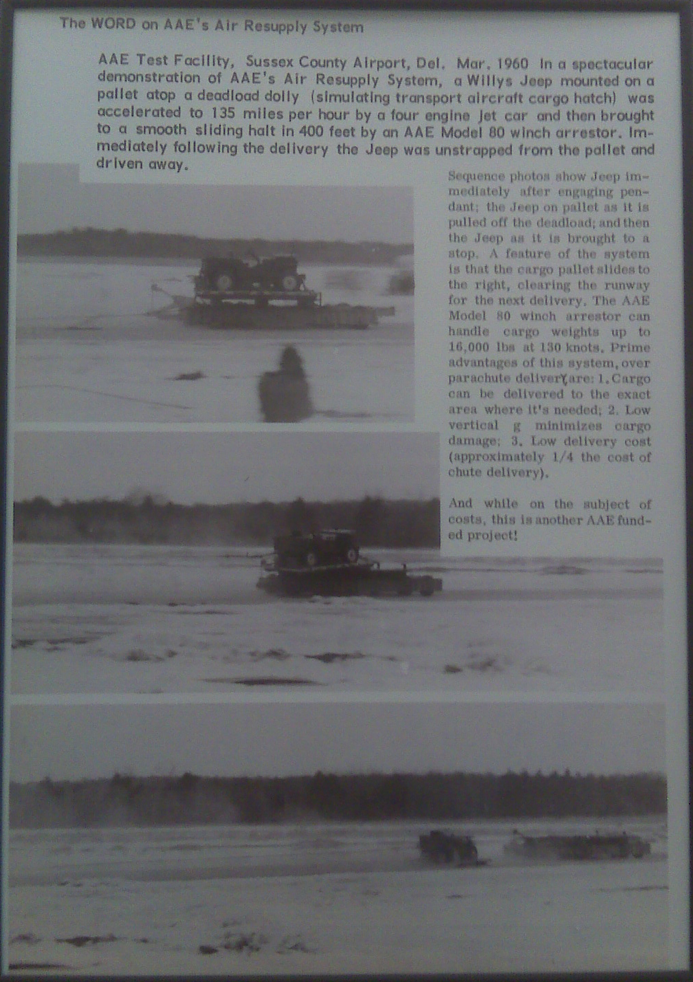 As I mentioned a couple days ago, a reader named Dave spotted this article and wanted to share it with readers. The article published in the 1960 edition of All American Word follows the All American Engineering Company Testing the air drop of a jeep by a pallet rather than via a parachute. To test this concept, the AAE built a special vehicle to mimic the landing of a jeep atop a pallet at speeds of 135mph. As you can see, the test was successful (at least the one captured in the photos).