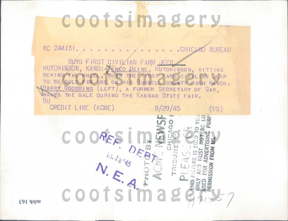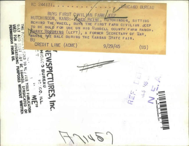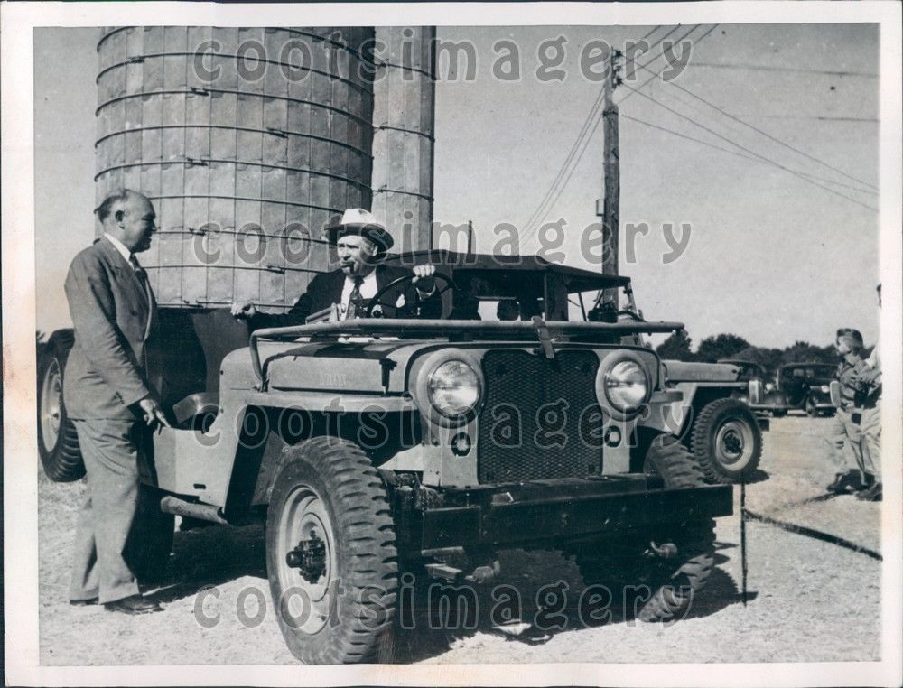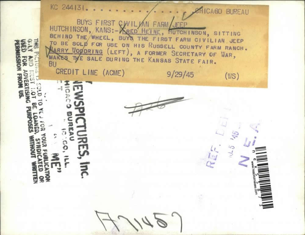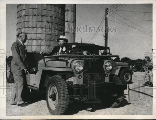 “1945 Press Photo Hutchinson Kansas Fred Heine buys Jeep for farm, H Woodring”