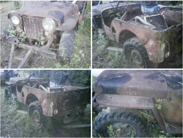 “This jeep is for parts. If you want a pristine Jeep, this one is NOT the one you need. I do not know if its all there, and the engine is probably not original. It has a 6 cylinder motor, which may be a Kaiser straight-six. Floor pan is rusted out. This jeep is old, but may be a good find if you’re looking for some parts.”