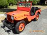 “1949 Willyz Jeep in great running condition. Will allow test drive for serious buyer. Four new non-directional tires; recent paint job (orange); new front floor board; comes with canvas top and doors that are in excellent condition.”