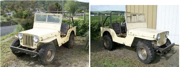 “1947 CJ-2A. All original & Complete. L134 Flathead (one cylinder stuck from sitting) does not run at this time. Original running gear. Good shape overall. Some rust at the body mounts, but rest of tub, etc, is good. WA Title. Note: Jeep is located on east side, near Walla Walla, WA.