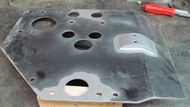 The local metal fabrication shop cut and bent an eighth inch thick skidplate for the V6 oil pan. After drilling a one inch diameter hole for the drain plug (that’s the only size hole saw I have) I hand filed the hole to one and a half inch diameter before welding the skid plate to the pan.