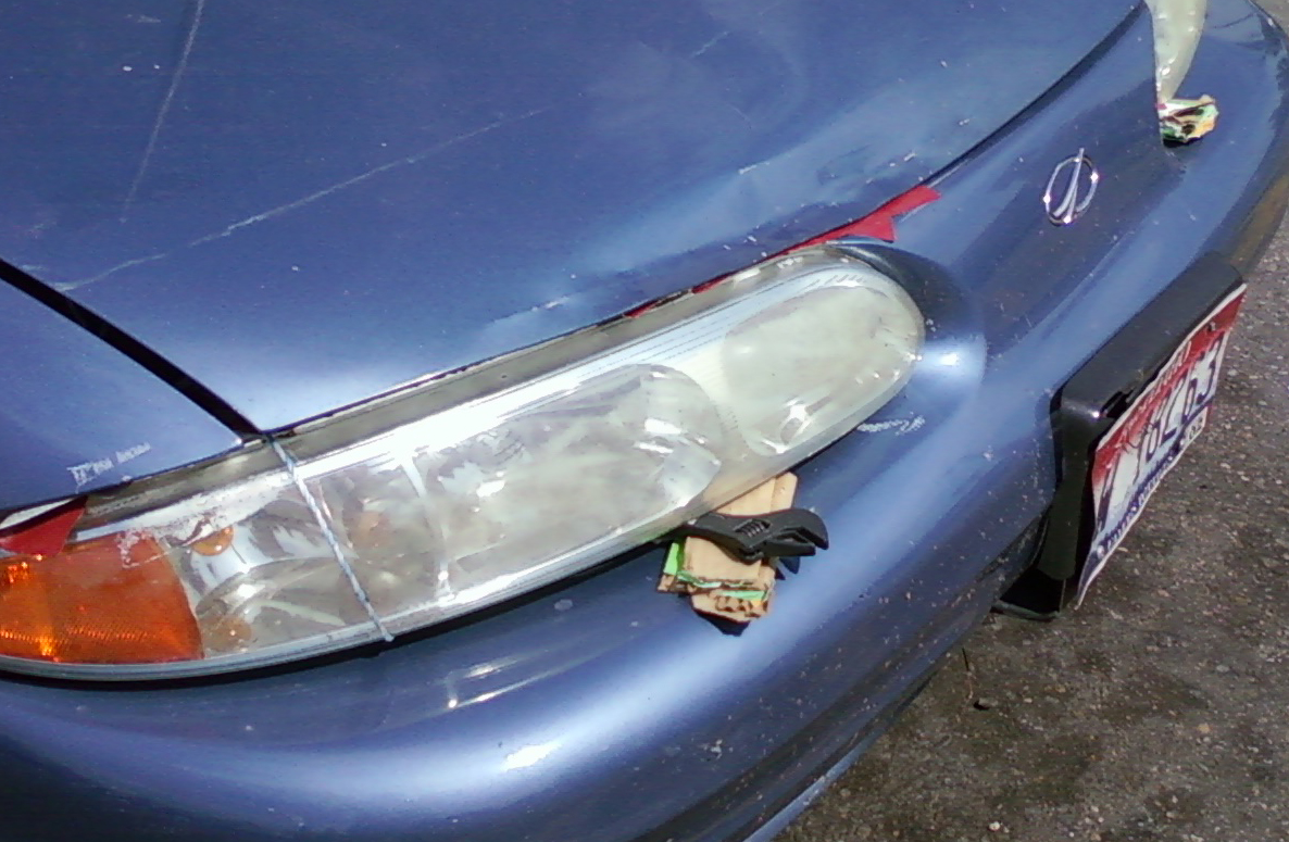 Then, I came to my senses; Because, really, what do you do when the cardboard separating your bumper from your headlights no longer provides adequate support? Of course, the natural solution is to slip a crescent wrench into the space. After all, how much damage could a crescent wrench do if it were to get loose and bounce into the car next to you or behind you ….