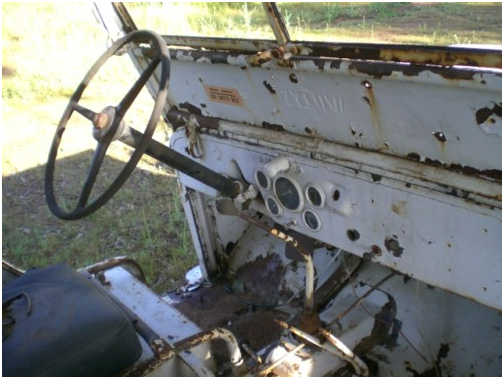 At some point in the past, a pipe vise was added to the front bumper, it can easily be removed.  Also, barely visible below the driver’s windshield is a red stenciled ” FIVE STAR GENERAL” .  No, I don’t believe it was a real 5-star general, just a guy who was very happy with his unique jeep.