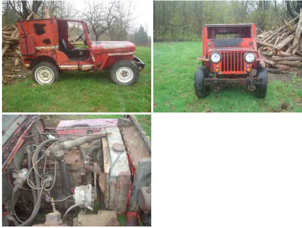 “1948 Willys CJ2A Jeep with L134 (4 cyl.) engine and 3 speed transmission. Not running, body rough, needs windshield glass, carburetor and passenger seat, but has Harrison heater. No title, sold with bill of sale. ”