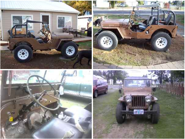 “1947 WILLY’S JEEP 225 CU IN V-6 $3000.00 OBO RUNS GOOD, CURRENT TAGS, CLEAR TITLE, 2 BACK JUMP SEATS, HAS BIKINI TOP, NEW BRAKES, NEEDS SOME WORK, HAVE SOME EXTRA PARTS”