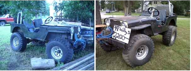 “48 jeep willys flatfender river jeep no rust but for little on underneath braces, wavy body but solid, needs a home out of the weather. original 4cylinder engine runs but needs coil or something but i forget. very tough jeep.”