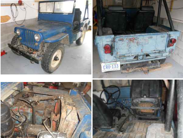 Garage kept for many years. Very little rust, original body with Willy’s logos on fenders, Windshield and tailgate. 12-volt system. Includes Title, Parts Manual and Chilton Repair Guide. It is not running. It has not been driven for over 5 years. The carburator needs to be rebuilt and there are no breaks. The transmission is in good shape. The transfer case does have a PTO (No Attachments). Mileage unknown”