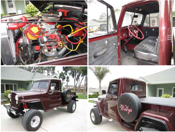 “Willys, 1949, very nice restoration featuring a 4.1 V/6 Buick and a GM 200R 4 speed automatic, 4 wheel drive, burgondy paint with hand painted pin striping, both inside and out, gray tweed interior, beautiful after market oak wood bed, aluminum wheels and 35″ tires, and it is a head turner and trophy winner. Email me for more pictures and information.”