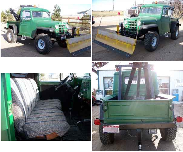 “1953 Willys 4X4 Pickup with wrecker and snow plow package, Chevy power train, 305 SBC/TH350 Auto. Power steering and power brakes, Good tires. Interior redone. New Hercules lined bed, fenders and floor pan.