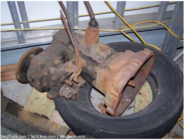 2. The second is a T 90 Transmission with bell housing. Transfer case and E Brake Mount are attached. Came as a spare with the 1946 CJ2a. Levers all move in and out of position. $150