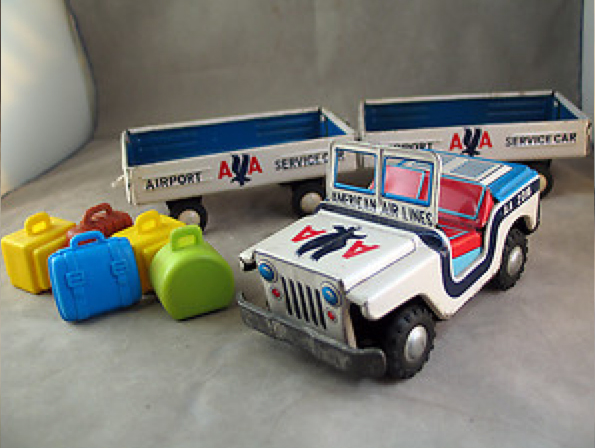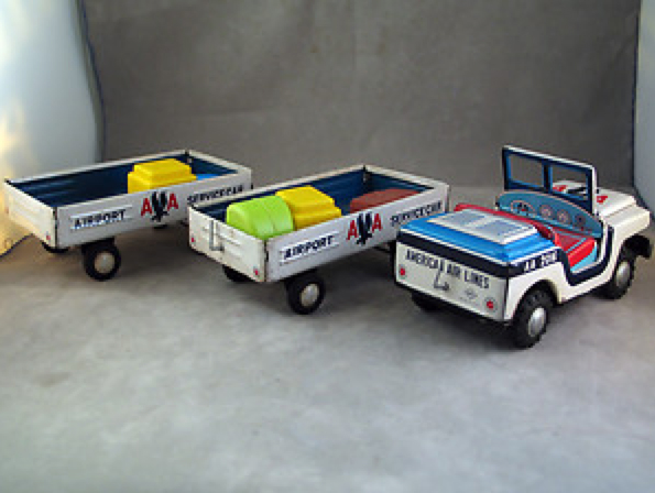 “JAPAN tin toy vintage Airport Flat Fender Military Willys Jeep baggage delivery car. All original commercial toy includes two carts and the five original pieces of colorful plastic luggage. Friction powered Jeep, front wheel drive, runs smooth and strong. Red, white and blue body color. 16” long (408 mm). c. mid to late 1950’s. Marked made in Japan. Missing nothing. Great vintage American Airline logo and graphics lithographed throughout indicating “AIRPORT SERVICE CAR”.”
