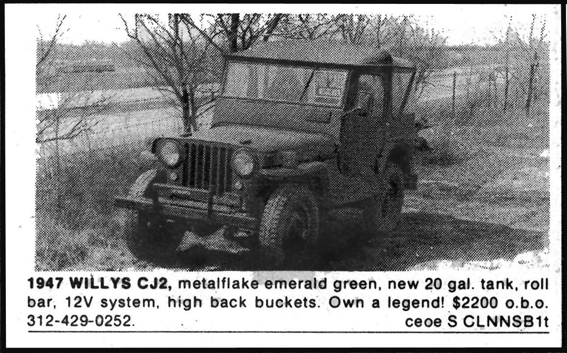 “I bought this 1947 CJ2A in 1996 from a guy named Martel south of Chicago in Palos Park, Illinois for $600 and sold it for $600 in 1997 for $600 to an elderly gent who was from the area east of where I lived in Tinley Park, Illinois. It had been well restored before I owned it but financial problems and mechanical inexperience back then in my misspent youth prevented me from proper upkeep. It was painted a metalflake emerald green and sported a unique front bumper and a vent cover in front of the drivers side on the front panel. I have no record of the serial number from the engine block and it had no title. I was wondering if anyone had seen it? Ever?”