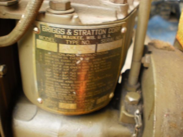 “i have a ww2 generator that is in excellent original working condition.model I cast iron briggs engine.tag reads type 206103,serial# 99832 which puts this engines mfg in 1944. this unit is in excellent original unboogered and unmolested with conditon.starts right up even after sitting for years. always kept in the dry.clean fuel tank and settling bowl.generator works awesome.all original paint and nelson ww2 era muffler.great for ww2 enactors or for a ww2 jeep.”