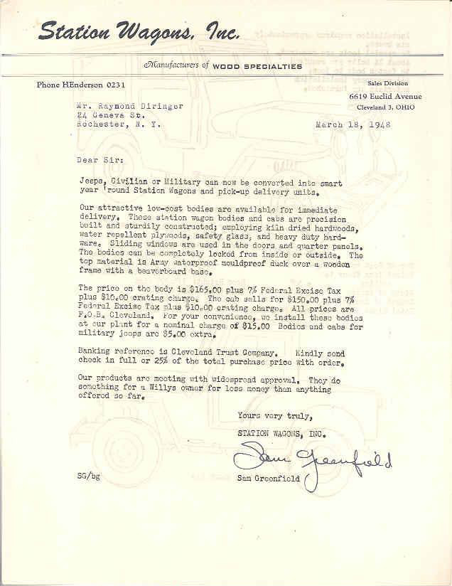 Here’s a rare letter that advertises woodie kits from Station Wagons, Inc, for CJ-2A and MB/GPW models. This 2 page letter shows both a full and a half cab. Below the two page letter is an example of an ad that appeared in Popular Mechanics.