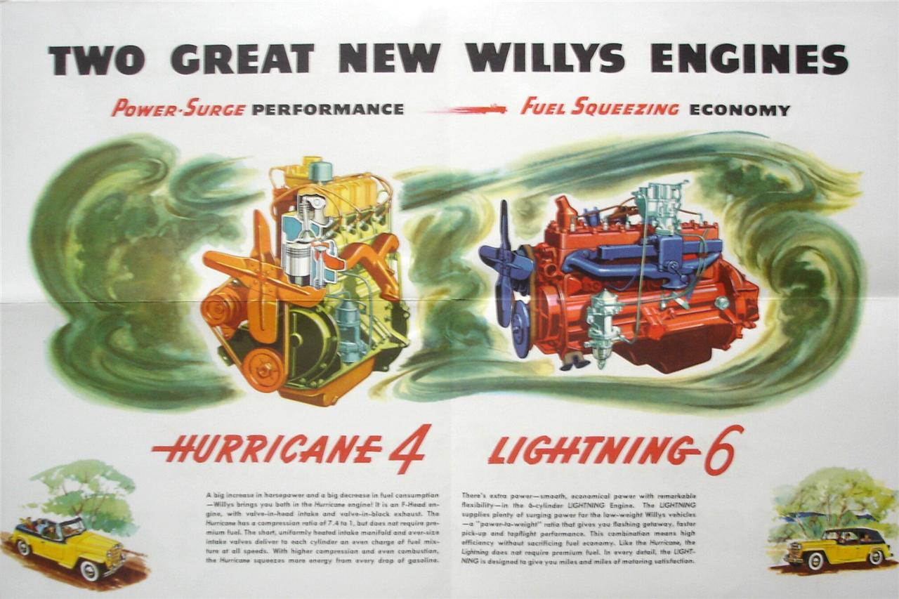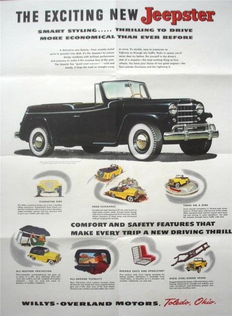 ” THIS IS AN UNCIRCULATED, EXCELLENT, ORIGINAL 1950 WILLYS JEEPSTER MAILER BROCHURE. NEVER STAMPED, WRITTEN ON OR MAILED. SIZE IS 8 1/4″ X 5 1/2″ AND UNFOLDS TO 16 1/2″ X 22″. CODE VJ73M1 AND DATED 3/50.”