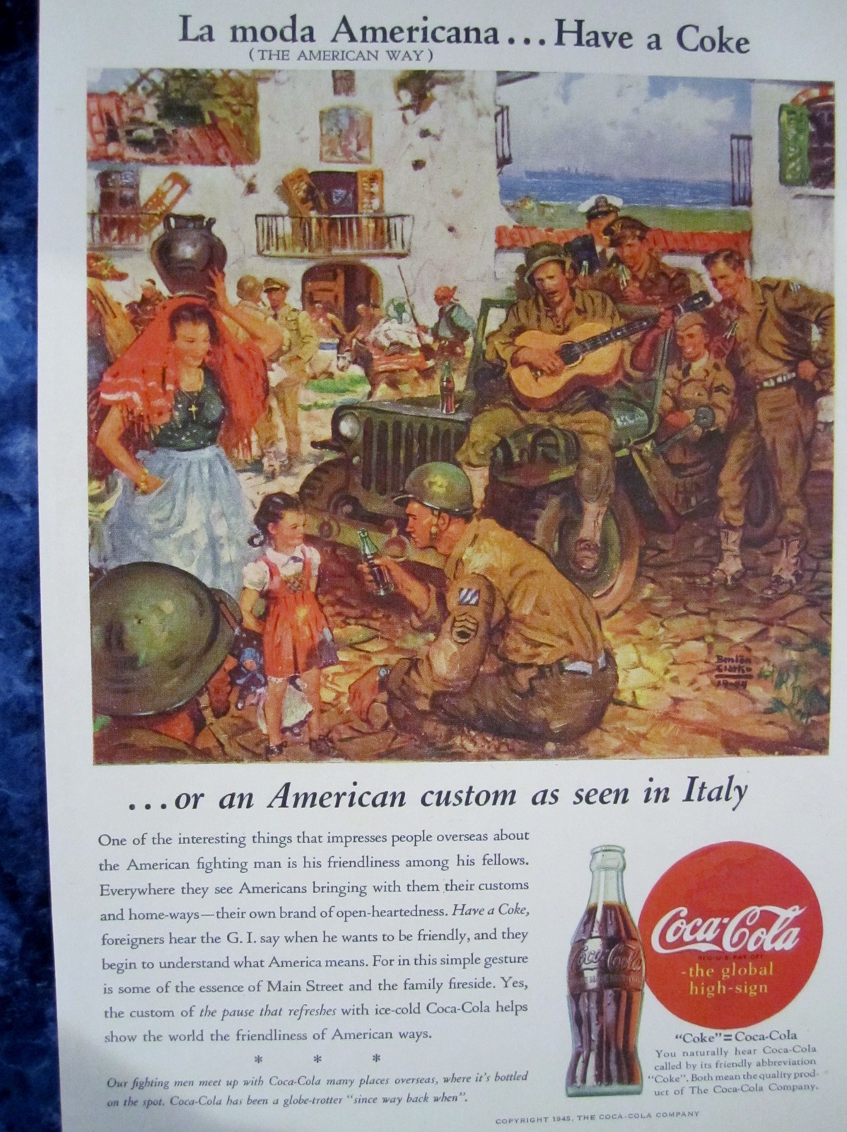 Here are a couple items that mix jeeps and Coke. The ad is supposed to be original, while the sign is a reproduction.