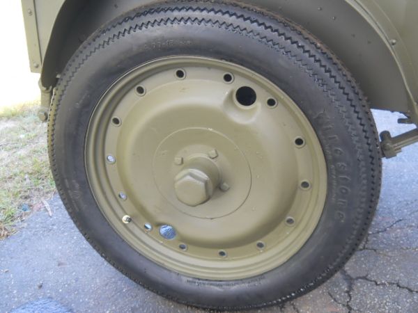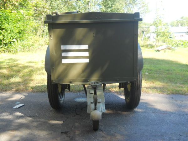 “This is a 1942 dated WW2 K-38 Signal Corps Trailer designed to go behind a Willys Jeep. It has been sandblasted, primed and re-painted in #33070 Olive Drab. It has new WW2 type Firestone tires. The original lunette has been replaced with a ball hitch. $1500.00.”