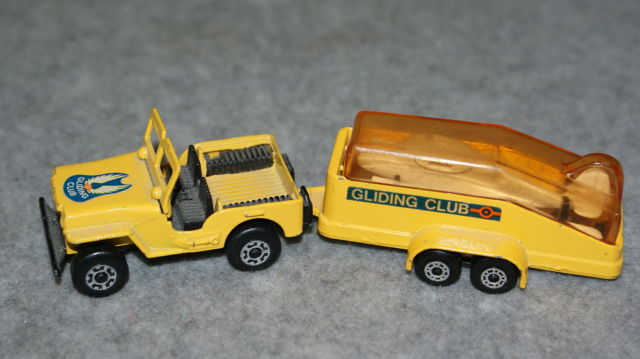 “UP FOR AUCTION, A SWEEEEEEET USED MATCHBOX … no.36 JEEP WITH GLIDING CLUB TRAILER, & GLIDER PLANE, MADE IN ENGLAND, BY LESNEY 1976… THIS IS A VERY COOL JEEP AND TRAILER, IT COMES WITH A GLIDER PLANE YOU PUT TOGETHER, AND IT ALL FITS IN THE WAY COOL TRAILER.. ONLY ONE THING WRONG WITH THIS UNIT, THE PLASTIC GLASS TOP DOES NOT FIT THE TRAILER THAT GOOD, IT’S A LITTLE LOSE ON THE FIT….THERE IS NORMAL PAINT CHIPPING ON THIS TOY, HAS NORMAL WEAR, ALL TIRES ARE IN GOOD SHAPE…… THIS IS A USED TOY AND BUYING AS IS.”