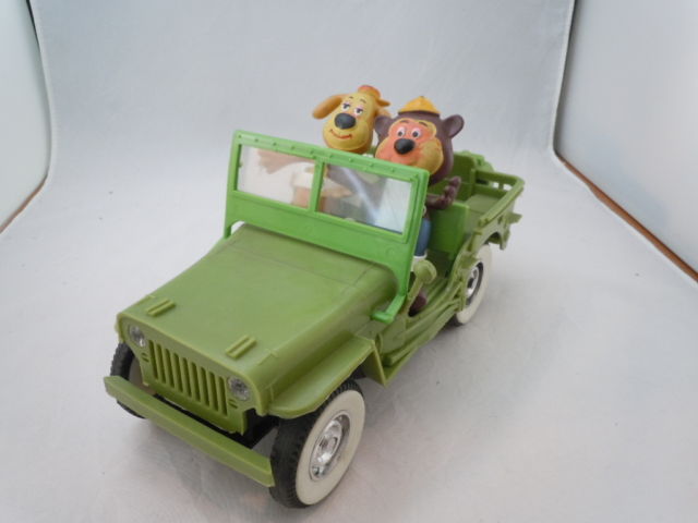 “This is a vintage battery operated Cragstan Jeep with Flexible Smokey Bear and Sandy bendy figures in original box. Made in Hong Kong. Model # 2579-1. About 11″ long. Toy is in C9.5+ shape. I put batteries in and it worked well (the gear lever is the on and off switch) but the battery door can barely close due to poor manufacturing tolerances. Box is in C4 shape, pretty torn up as you can see in the pics.”