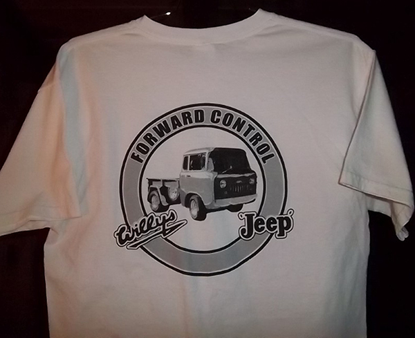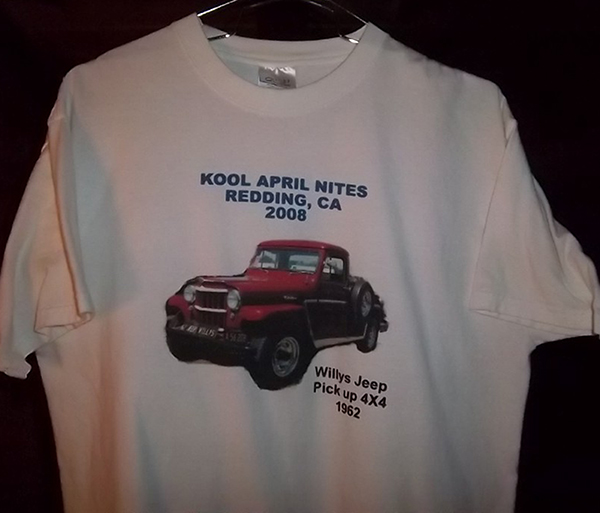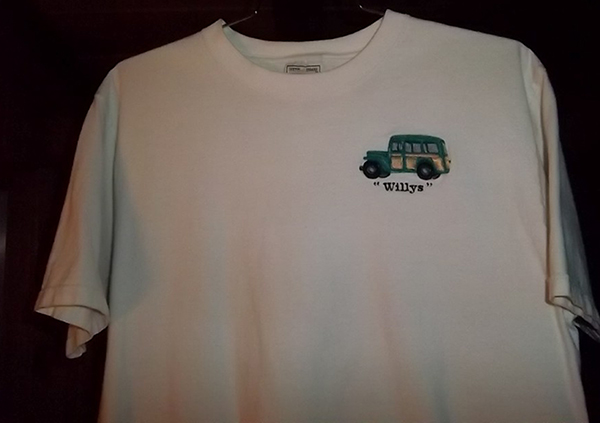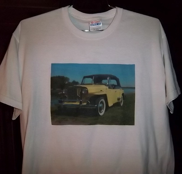 4) Here are two unique “photo print” T-shirts. They are one-of-a-kind custom made T-shirts from a photo. The first one is of my ’49 Jeepster Phaeton. This was a gift to me. The second one is of my friend’s beautifully restored ’62 Willys Pickup, made at a car show booth.