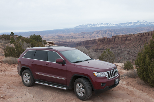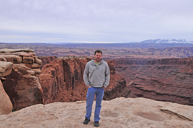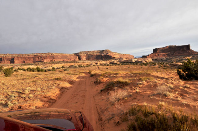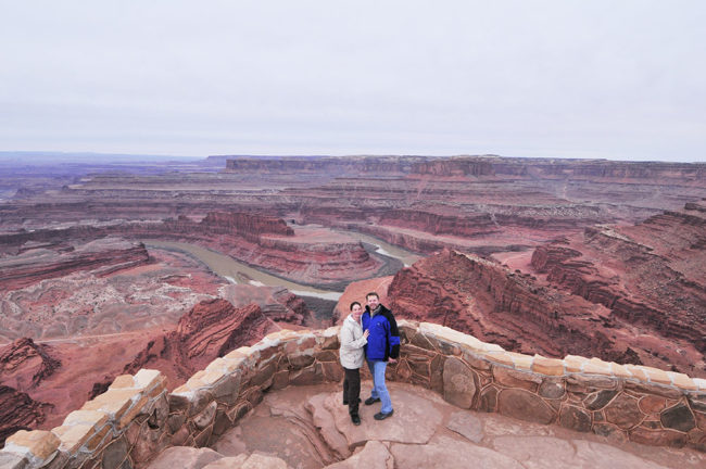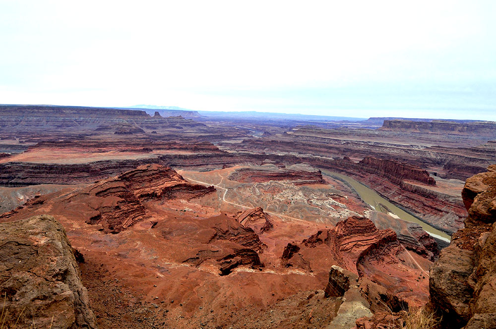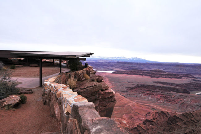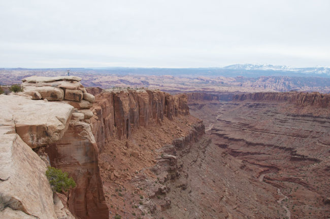 Next, we continued along Highway 313 toward Dead Horse Point State Park. It’s has amazing vista overlooking Canyonlands National Park, with it’s twisting, turning rivers wriggling amongst a vast rocky landscape. The views are incredible, even on a cloudy morning. I’m sure on a sunny, cloudless morning, the rock would be a bright reddish-orange.