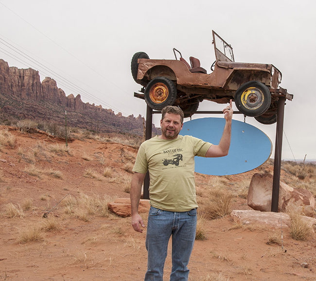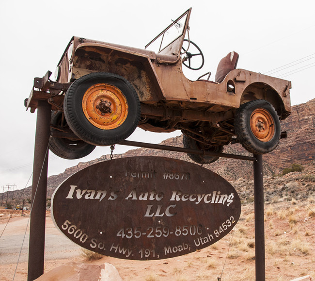 South of Moab a few miles, we spotted this jeep, one that has become a permanent fixture. It hovers above Ivan’s Auto Recycling Sign. I’ve seen pictures of it, but hadn’t done a closeup inspection. It turns out to be a CJ-2A with three data plates (though the plates themselves are gone). It might also have had indents, but the driver’s side is so hammered, I can’t positive tell if it did or didn’t.