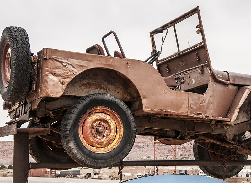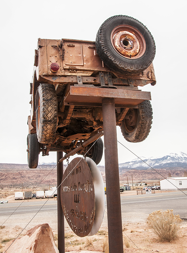 Though we were curious enough to take photos from the highway, we were too busy hurrying south towards our fateful encounter with Canyon De Chelly. While we took some good photos, we missed getting a photo of the “license plate” jeep sculpture, which sits in the parking lot of the convenience store. I always wondered where that sculpture was. Next time, we will stop and check it out more closely. In the meantime, you can learn more about this tourist trap from these travelers.