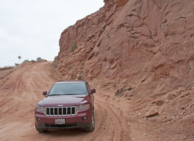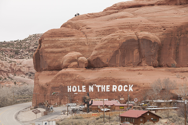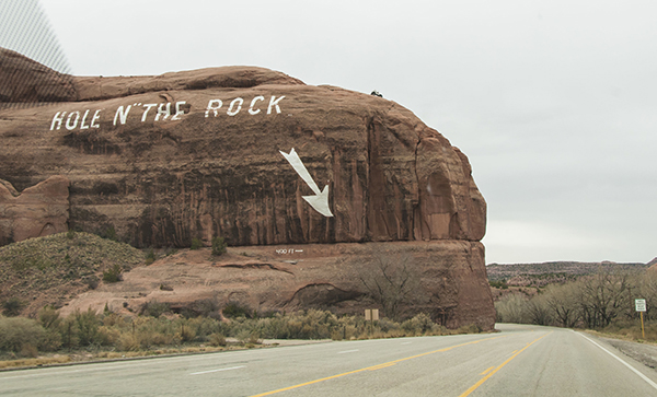 The trip out of Moab is beautiful, as the drive south along Highway 191 takes you through some beautiful red rock scenery. At one point, right after a lovely curve, look to the rocks above and you’ll see a jeep way above the scenery: welcome to Hole ‘N’ The Rock.